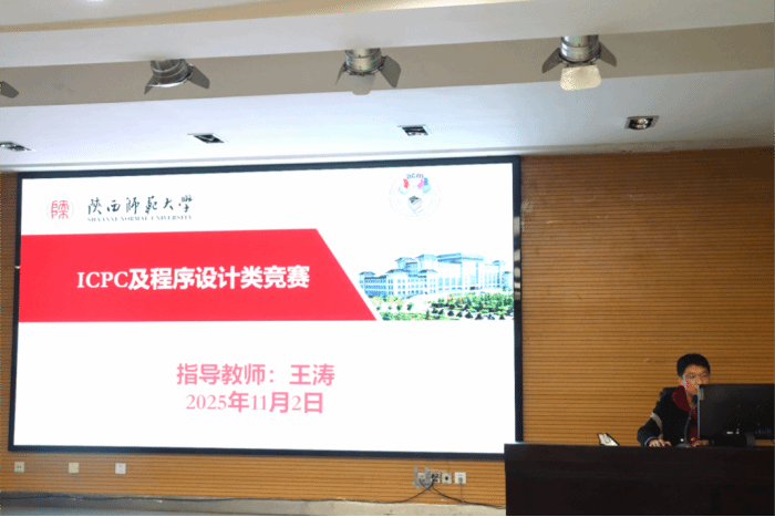 ICPC竞赛集训队教练王涛老师为同学们介绍了ICPC竞赛、蓝桥杯等程序设计类竞赛的背景、赛制、要求、评判标准。他特别向大家展示了分站赛往届斩获奖牌的经验,希望同学们能在竞赛中磨练出过硬的专业能力。