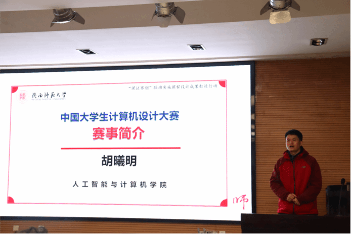 胡曦明老师介绍了中国大学生计算机设计大赛,展示了该竞赛的基本信息、规模与要求,简要概括了竞赛的特点,分析了竞争强度与适配程度。他谈到,虽然竞赛难度逐年加大,但近年来学院参赛学生在软件应用开发、物联网应用等赛道的成绩仍稳步提升,竞赛是同学们磨砺自我的宝贵机会。